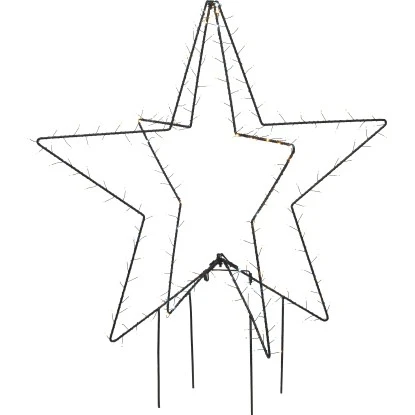 Der große beleuchtete Stern bietet einen außergewöhnlichen Lichteffekt für Garten, Terrasse oder Wintergarten. Er verbreitet eine weihnachtliche Stimmung und bietet zugleich einen modernen 3D-Effekt. Die Sternsilhouette ist von allen Seiten gut erkennbar und wird als räumlicher Stern wahrgenommen. Die Höhe beträgt 86 cm bei einem Breiten- und Tiefenmaß von jeweils 99 cm. Hergestellt ist die Deko-Figur aus schwarzem Metall. Es zeichnet sich durch Robustheit aus und punktet durch Witterungsbeständigkeit. Zum Aufstellen ist der Stern mit Stangen versehen, die sich bei Bedarf in den Erdboden des Gartens stecken lassen. Die Dekoration ist für den Innen-& Außenbereich geeignet.