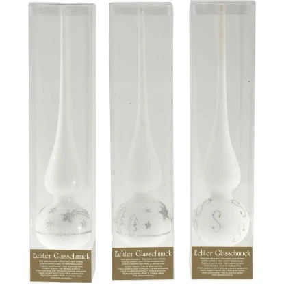 Der Baumschmuck Baumspitze aus Glas in 3 Ausführungen Weiß-Silber 28 cm x 6 cm ist Weiß und Silber. Sie ist erhältlich in drei Ausführungen. Die Maße betragen 28 cm x 6 cm. Sie ist ein unverzichtbares Accessoire für den Weihnachtsbaum.