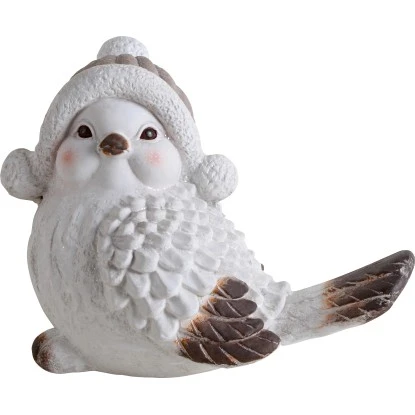 Der detailliert gestaltete Kunststein-Vogel mit Mütze dient als weihnachtliche Dekofigur zum Aufstellen auf der Kommode, Fensterbank oder dem Tisch. Er trägt eine Mütze und ist mit einem niedlichen Gesicht gestaltet. Seine Höhe misst 22 cm, bei einer Breite von 36 cm und Tiefe von 29 cm. Hergestellt ist der Vogel aus witterungsbeständigem Kunststein. Aufstellen lässt er sich im Innen- und Außenbereich.