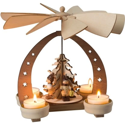 Angetrieben durch die aufsteigende Wärme der 4 Teelichtkerzen, bewegt sich langsam und gleichmäßig das Flügelrad dieser wunderschönen Tischpyramide aus Holz. Liebevoll von Hand gefertigte Details begeistern nicht nur Liebhaber dieser Weihnachtstradition.