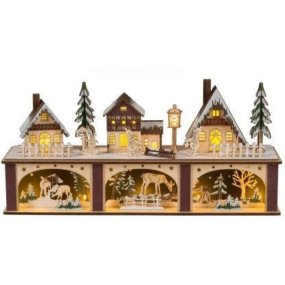 Die wunderschöne Stadtszene aus Holz verschafft ein weihnachtliches Ambiente. Sie haben bei unserem LED-Artikel die Auswahl zwischen Trafo-Netzbetrieb und Batteriebetrieb. Der Trafo ist inklusive. Die Timerfunktion ist ein komfortabel und energiesparend zu gleich.