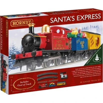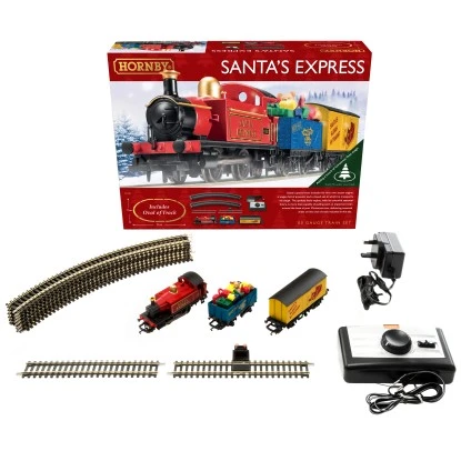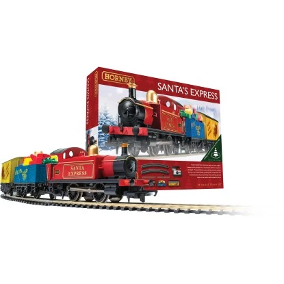 Das Hornby Zug-Set Santa’s Express ist ein komplettes Zugset. Dieser hochwertige Zug ist im Maßstab 1:76 und funktioniert mit Strom. Das Set enthält eine Lokomotive und 2 Waggons, Schienen, einen Adapter und eine Fernsteuerung. Er ist etwa 92 cm x 77 cm groß. Dieser Zug mit Schienen passt z. B. gut unter einen Weihnachtsbaum.Das Set ist auch sehr schön in Kombination mit einem Weihnachtsdorf.