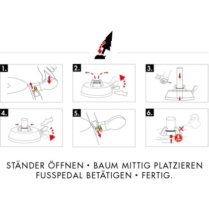 Die durchgehende Seilführung der original Rundum-Einseil-Technik garantiert dabei den gleichmäßigen Druck der Klauen an den Stamm. Einfach den Baum in den Ständer stellen, das Fußpedal treten, und schon ist der Baum aufgestellt. Ob dick, dünn oder krumm gewachsen, der Baum steht immer sicher und kerzengerade. Die patentierte Sicherungsglocke im Fußpedal signalisiert gut hörbar, wenn die Klauen sicher und fest am Baum anliegen und der Verschluss des Fußhebels automatisch eingerastet ist.