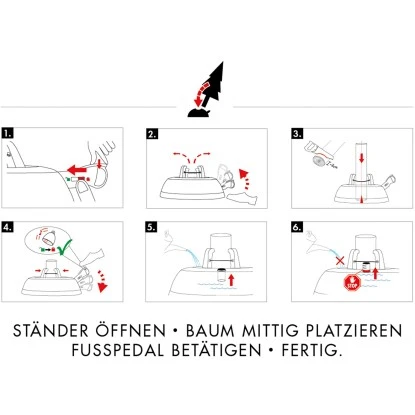 Die durchgehende Seilführung der original Rundum-Einseil-Technik garantiert dabei den gleichmäßigen Druck der Klauen an den Stamm. Einfach den Baum in den Ständer stellen, das Fußpedal treten, und schon ist der Baum aufgestellt. Ob dick, dünn oder krumm gewachsen, der Baum steht immer sicher und kerzengerade. Die patentierte Sicherungsglocke im Fußpedal signalisiert gut hörbar, wenn die Klauen sicher und fest am Baum anliegen und der Verschluss des Fußhebels automatisch eingerastet ist.
