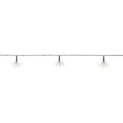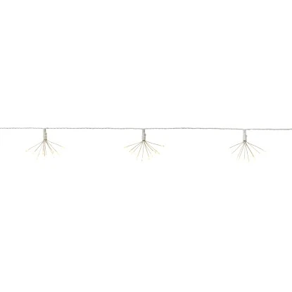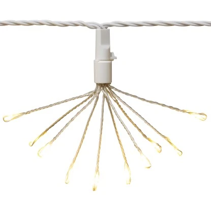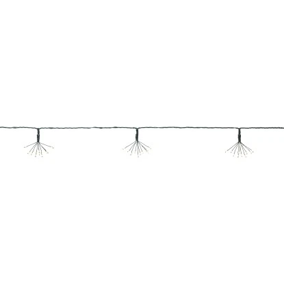 Ein gemütliches Ambiente stellt die LED-Lichterkette Feuerwerk mit ihren 200 LEDs her. Sie verschönert insbesondere die Winter- und Weihnachtszeit und verbreitet eine festliche Stimmung auf der Terrasse oder im Garten. Dabei fügt sich ihr grünes Kabel harmonisch in die Natur ein. Die Beleuchtung ist gleichermaßen für den Innen- wie Außenbereich geeignet. Insgesamt stellt sie eine Länge von 10,7 m zur Verfügung, wobei 5 m auf das Zuleitungskabel entfallen. Die Feuerwerkslichterkette ist mit einer energiesparenden und langlebigen LED-Technologie ausgestattet. Ihre 20 hängend ausgerichteten Lichtbündel strahlen in natürlicher, warmweißer Lichtfarbe.