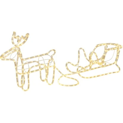 Der LED-Lichtschlauch Rentier mit Schlitten dient als Wintermotiv bei Ihrer Weihnachtsdekoration. Er bildet die Umrisse eines Rentiers mit Geweih sowie den Schlitten detailgetreu nach. Das Gesamtbild vermittelt eine festliche und stimmungsvolle Atmosphäre. Die Höhe beträgt 46 cm bei einer Breite von 24 cm und einer Länge von 153 cm. Gut geeignet ist die Figur aufgrund ihrer Größe für den Garten, die Terrasse und den Wintergarten. Das Aufstellen des Weihnachtsmotivs erfolgt unabhängig vom Untergrund am Ort Ihrer Wahl im Innen- und Außenbereich.