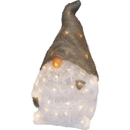 Der LED-Wichtel dient zur winterlichen Dekoration in Garten, auf der Terrasse oder im Eingangsbereich. Er ist transparent-weiß gehalten mit braun abgesetzter Wichtelmütze, angedeuteter Nase und Handschuhen. Insgesamt misst die Figur 50 cm in der Höhe, bei einer Breite von 28 cm und 22 cm Tiefe. Gefertigt ist sie aus Acryl, das widerstandsfähige und pflegeleichte Eigenschaften besitzt. Zur Dekoration kann die Wichtelfigur einfach aufgestellt werden. Geeignet ist sie gleichermaßen für den Innen- und Außenbereich. Integriert sind energieeffiziente LED-Lampen, die über einen Stromanschluss mit 5 m langer Zuleitung betrieben werden. Für die warmweiße Beleuchtung sorgen insgesamt 60 festverbaute LEDs.