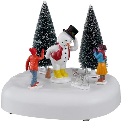 Die Lemax Weihnachtsdekoration Frosty der Schneemann sagt Hallo zeigt einen Jungen und ein Mädchen mit Hund. Sie betrachten den Schneemann mit dem Zylinder. Der Hund geht interessiert hin und her.