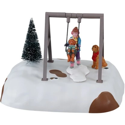 Die Lemax Weihnachtsdekoration Schaukelnder Welpe zeigt einen Welpe auf der Schaukel, der von seinem Besitzer angeschubst wird. Die Schaukel geht hin und her und Mama Hund schaut zu.