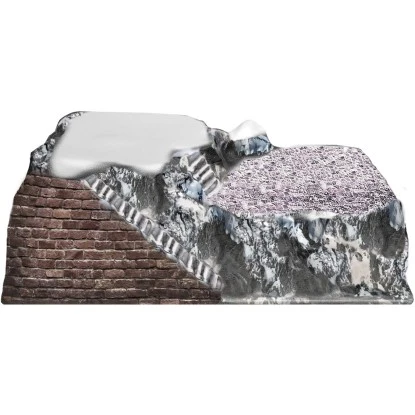 Die Berglandschaft ist in mehreren Farben und mit einem Relief bedruckt. Das Modell bietet Platz für 2 Häuser und etwas Zubehör. Der Berg hat 2 Oberflächen in unterschiedlichen Höhen.