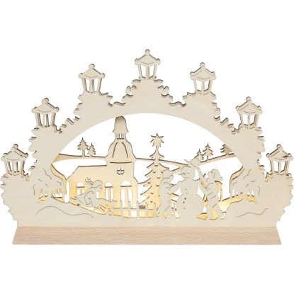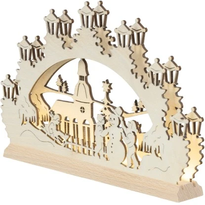 Der Mini-Lichterbogen Schneemann von Saico ist besonders liebevoll gestaltet und stellt eine winterliche Stadt dar, in der die Kinder im Schnee toben. Die elektrische Innenbeleuchtung durch einen LED-Stripe und Timerfunktion am Trafo sorgt für ein lebhaftes Gesamtbild und strahlt Gemütlichkeit aus. Mit einer Größe von ca. 22 mm x 14 mm x 30 mm belebt der Schwibbogen jedes Sideboard. Die Beleuchtung ist in Form von einem kleinen Holzsteg verblendet und fügt sich so bestens in das Motiv ein. Der Mini-Lichterbogen beeindruckt durch seine Qualität aus dem Erzgebirge und ist ein Stück Handwerkskunst gefertigt in Deutschland.