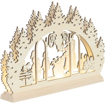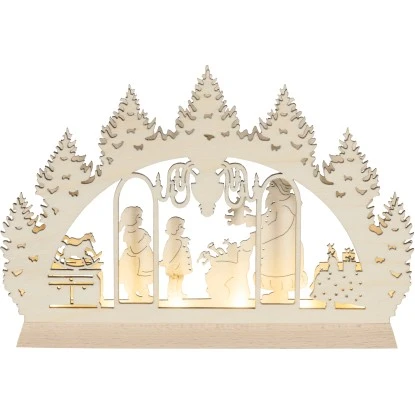 Der Mini-Lichterbogen Weihnachtsmann von Saico ist besonders liebevoll gestaltet und stellt die Bescherung am Weihnachtsabend dar. Die elektrische Innenbeleuchtung durch einen LED-Stripe und Timerfunktion am Trafo sorgt für ein lebhaftes Gesamtbild und strahlt Gemütlichkeit aus. Mit einer Größe von ca. 22 mm x 14 mm x 30 mm belebt der Schwibbogen jedes Sideboard. Die Beleuchtung ist in Form von einem kleinen Holzsteg verblendet und fügt sich so bestens in das Motiv ein. Der Mini-Lichterbogen beeindruckt durch seine Qualität aus dem Erzgebirge und ist ein Stück Handwerkskunst gefertigt in Deutschland.