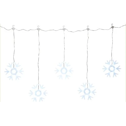 Der wunderschöne LED-Schneeflockenvorhang eignet sich für eine besonders winterliche Weihnachtsbeleuchtung sowohl im Innen- als auch im Außenbereich. Durch die 36 kaltweißen und sparsamen LEDs wird ein angenehmes Licht erzeugt, welche für eine festliche Weihnachts- und Winterzeit sorgen. Je Schneeflocke leuchten 6 LEDs. Einen flexiblen Einsatz im Haus oder Garten ermöglicht die 5 m lange transparente Zuleitung. Die Maße des beleuchteten Teils sind 125 cm x 50 cm.