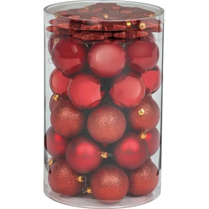 Mit dem Baumschmuck-Set lässt sich der Weihnachtsbaum individuell gestalten. Das gemischte 3D-Set besteht aus Kugeln und Sternen. Insgesamt sind 50 Teile in Rot enthalten, darunter 34 Kugeln und 16 abgeflachte Sterne. Hergestellt ist der Baumschmuck aus langlebigem Kunststoff. Die Deko-Objekte sind mit unterschiedlichen Oberflächen ausgeführt, sodass einige glitzern oder glänzen und andere matt oder satiniert sind. Während die Kugeln über einen Ø von 6 cm verfügen, misst der Ø der Sterne 6,3 mm. Sie lassen sich ohne weitere Befestigungen mittels der beiliegenden S-Haken einfach über die Zweige hängen.